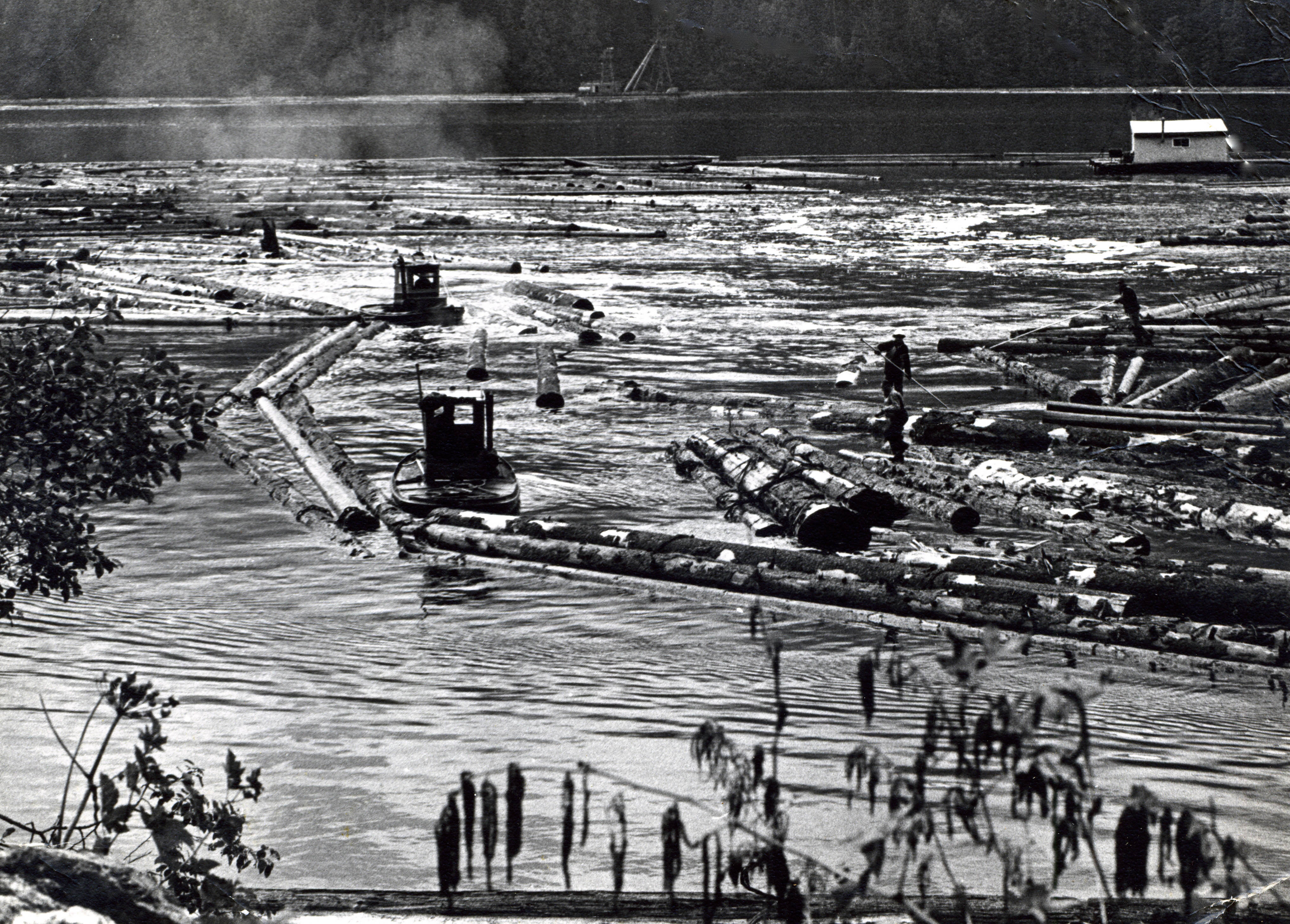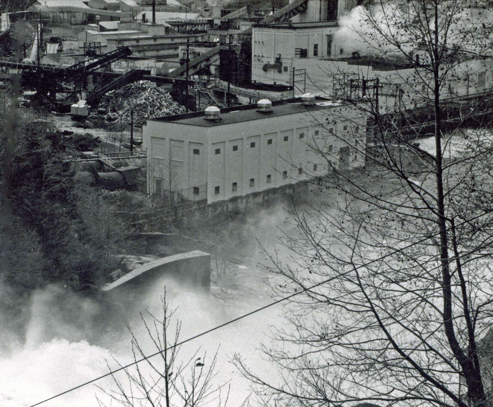 Hog Fuel conveyors with the Power plant and smoke stack behind.